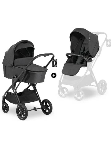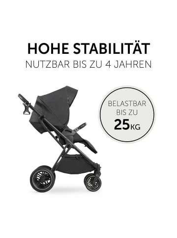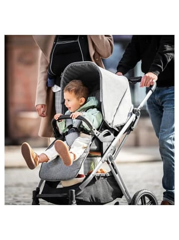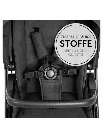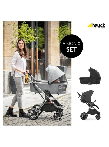 – All-Terrain-Reifen aus Gummi– schwenk- und feststellbare Vorderräder– höhenverstellbarer SchieberDas 2in1 Kombi Kinderwagen Set Vision X von hauck begleitet Familien ab der Geburt und ist für lange Zeit ein flexibler Begleiter. Anfangs haben es Babys im Kinderwagenaufsatz auf der atmungsaktiven Matratze sehr bequem. Das große Verdeck ist mit einem UV-Schutz ausgestattet. Zusätzlich ermöglichen zwei Mesh-Sichtfenster eine optimale Belüftung. Babys können außerdem in Bauchlage im Kinderwagen liegen und durch das in den Aufsatz integrierte Fenster ihre Umgebung beobachten.Für ältere Kinder, die bereits sitzen können, wird der Sportsitz auf dem Gestell angebracht. Den Sportsitz können Eltern so anbringen, wie es ihnen und dem Kind gerade am liebsten ist: mit Blickrichtung nach vorn oder zur schiebenden Person. Mit nur einer Hand kann die Rückenlehne verstellt und auf Wunsch in eine Liegeposition gebracht werden, damit das Kind auch im Sportsitz gut schlafen kann.Die Befestigung beider Aufsätze auf dem Gestell geht ganz schnell mit nur einem Klick. Auch eine Babyschale lässt sich bei Bedarf an dem Gestell befestigen. Angenehm für die Eltern ist der Becherhalter am Gestell, in dem der Kaffee stets in Reichweite ist. Außerdem passt sich die Schieberhöhe an die Größe der jeweils schiebenden Person an. Schwenkbare, feststellbare Vorderräder und All-Terrain-Räder ermöglichen auf jedem Untergrund eine erschütterungsarme und komfortable Fahrt.Lieferumfang:– Gestell– Kinderwagenaufsatz– Matratze– Sportwagenaufsatz– Beindecke– EinkaufskorbDetails:– leichte One-Click-Befestigung der Aufsätze auf dem Gestell– mit gepolstertem Tragegriff– Einhand-Faltmechanismus– abnehmbares Verdeck mit Sonnenblende und UV-Schutz 50+– 2 große Belüftungsfenster– Polsterung mit Extra-Kopfschutz– atmungsaktive Matratze– praktischer Getränkehalter– großer Einkaufskorb– Radart: GummiräderSportwagenaufsatz:– umsetzbare Sitzeinheit– Gurtsystem: 5-Punkt– verstellbare Rückenlehne mit Liegeposition– höhenverstellbarer, abnehmbarer Schutzbügel– Belastbarkeit: bis zu 22 kgMaße:– Raddurchmesser vorne: ca. 17,5 cm– Raddurchmesser hinten: ca. 26 cmMaterial:– Gestell: AluminiumStiftung Warentest 06/2022: “gut”, Lizenznummer 22DB84.Altersempfehlung:ab 0 Monat(e) bis 4 Jahr(e)