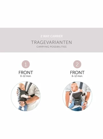 Die 2 Way Carrier verspricht wunderschöne Kuschelmomente mit Ihrem Baby. Eine sichere und komfortable Babytrage, in der Sie Ihr Kind ergonomisch korrekt tragen können. Egal, ob zuhause oder unterwegs, mit der 2 Way Carrier wird das Tragen in zwei Varianten leicht gemacht. Die unzähligen Verstellmöglichkeiten und die verstärkte Kopf-und Rückenpartie fördern die korrekte Haltung und bieten einen hohen Tragekomfort.Ganz nah. In dieser kuscheligen Babytrage fühlt sich Ihr Kind rundum wohl und geborgen. Es kann Sie jederzeit spüren und Sie überall hin begleiten. In der 2 Way Carrier tragen Sie Ihren kleinen Schatz in zwei verschiedenen Varianten ganz nah an Ihrem Körper. Zu Beginn mit dem Gesicht zu Ihnen, später schaut Ihr kleiner Schatz nach vorne und darf neugierig seine Umgebung erkunden.Für mobile Eltern. In der 2 Way Carrier tragen Sie Ihr Kind ergonomisch korrekt, komfortabel und sicher. Gleichzeitig erleichtert die 2 Way Carrier den Alltag mit Ihrem kleinen Schatz ungemein. Sie macht Treppensteigen, Bus fahren oder Dinge im Haushalt erledigen, viel einfacher. Die 2 Way Carrier ist besonders leicht und faltbar, deshalb kann sie überall mit hingenommen werden.Mitwachsend. Die 2 Way Carrier garantiert Ihrem kleinen Schatz einen sicheren Halt und wächst mit. Damit Ihr Kind komfortabel sitzen kann und Sie es auch bequem und rückenschonend tragen können, wurde die 2 Way Carrier komplett ausgepolstert. Zusätzlich verfügt die Trage über edle Steppungen, die den empfindlichen Kopf-, Nacken- und Rückenbereich Ihres Kindes stützen. Die seitlichen Polsterungen in Kopfnähe bieten dem Babyköpfchen Halt. Die Weite lässt sich durch Schnallen regulieren. Ebenso kann der gepolsterte Bereich um die Hüfte durch Klettverschlüsse individuell verstellt werden. So können Sie die Babytrage jederzeit an die Größe Ihres Kindes anpassen. Gleichzeitig sorgen Sie für eine altersgerechte und korrekte Haltung. Der Bereich um die Beinöffnungen ist nochmals zusätzlich gepolstert, um die Beine zu entlasten. Durch die wärmeregulierenden Baumwollstoffe im Innenteil der Bauchtrage ist die 2-Way-Carrier sowohl im Sommer als auch im Winter ein stets gefragter Begleiter. Ist Ihr Kind größer und möchte die Umgebung erkunden, tragen Sie es in der 2 Way Carrier mit dem Gesicht nach vorne. Die Kopfstütze klappen sie nach unten, um dem Köpfchen zusätzlichen Halt zu bieten.Hier rutscht nichts. Die Schultergurte der 2 Way Carrier verlaufen hinter dem Rücken des Tragenden über Kreuz, um das Gewicht des Kindes besser zu verteilen. Durch Verschieben der sichernden Schnalle ist die Länge der Schultergurte regulierbar. Zusätzlich kann die Länge der Gurte individuell durch Schnallen an die Größe des Tragenden angepasst werden.Hinweis: Diese Babytrage kann für Kinder verwendet werden, die schon selbständig ihren Kopf halten können.Maße: 40 x 25 x 16 cmMaterial: 100% PolyesterPflegehinweis: abwaschbarAltersempfehlung:ab 0 Monat(e) bis 12 Monat(e)