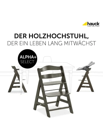 Der besonders hochwertig verarbeitete Premium-Hochstuhl Alpha+ Select von Hauck ist aus Buchenholz gefertigt. Er passt sich perfekt an das Wachstum des Kindes an und harmoniert mit vielen Wohnungsinterieurs. Auch in puncto Sicherheit liegt das High-End Produkt ganz vorn: Der Schutzbügel, der Schrittgurt und das 5-Punkt-Gurt-System sind hierfür verantwortlich. Altersempfehlung: ab 6 Monaten bis ins Erwachsenenalter, Belastungsgrenze 90 kg Material: Gestell aus lasiertem Buchenholz mit Metalldetails Verstellbarkeit: Rückenlehne und Fußstütze verstellbar, höhenverstellbar Sicherheit: 5-Punkt-Gurt-System, Schrittgurt Lieferumfang: Hochstuhlgestell, Schutzbügel, 2 Gurtsysteme Der Hochstuhl Alpha+ Select kombiniert tolles Design mit praktischen Funktionen und einem durchdachten Sicherheitskonzept. Er begeistert bereits auf den ersten Blick mit seiner coolen Linie. Er ist aus lasiertem Buchenholz gefertigt. Oberflächenveredelte Metallelemente verleihen dem Hochstuhl den individuellen Look. So fügt er sich perfekt in das persönliche Wohnkonzept ein. Das Kind kann den Hochstuhl ab circa sechs Monaten nutzen, wenn es selbstständig sitzen kann. Der Hochstuhl wächst dabei mit dem Kind mit. Mit der höhen- beziehungsweise tiefenverstellbaren Sitz- und Fußplatte passen Eltern den Stuhl an die Größe des Kindes an. So sitzt es immer ergonomisch optimal und komfortabel. Der Bügel bietet dem Kind Sicherheit vor dem Herausfallen und eine Möglichkeit, sich festzuhalten. Für doppelten Schutz sorgen der Schrittgurt in cooler Lederoptik und das 5-Punkt-Gurtsystem. Der Hochstuhl ist sehr kippsicher und ideal geeignet für Kinder mit einem Alter von bis zu circa zwölf Jahren. Er bietet aber auch Erwachsenen bis zu 90 Kilogramm eine bequeme Sitzmöglichkeit. So wird er zum lebenslangen Begleiter. Hinweis Mit dem separat erhältlichen Alpha Bouncer Premium Newborn-Set ist der Hochstuhl schon ab der Geburt des Babys verwendbar. Auch der Alpha Cosy Select-Sitzverkleinerer und die Hochstuhlauflage Highchair Pad Select eignen sich als Ergänzung. Die Esstische Alpha Wooden Tray oder Alpha Tray runden das Ensemble perfekt ab. Alle genannten Produkte können separat erworben werden.Länge: 0,1 cmBreite: 56 cmHöhe: 77 cmPflegehinweise:* Bleichen: Nicht bleichen* Waschen: Handwäsche maximale Temperatur 40°Alter geeignet ab: 6 Monaten,Belastbar bis: 90 kg,Geschlecht: UnisexAltersempfehlung:ab 6 Monat(e) bis 10 Jahr(e)