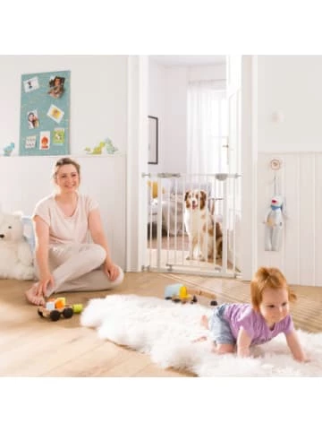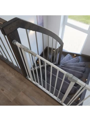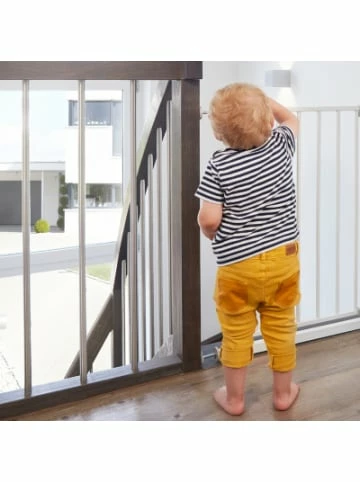 Kinder sind immer neugierig und wollen ihre Umwelt entdecken. Das Schwenk- Türschutzgitter macht jede Entdeckungsreise zu einem sicheren Abenteuer.Dieses selbstschließende Türschutzgitter ist die perfekte Lösung, um sich bei den Erkundungstouren des Nachwuchses nicht aus der Ruhe bringen zu lassen. Dank m Magnetverschluss und Zwei-Phasen-Indikator sind Sie und Ihr Kind immer auf der sicheren Seite.Dieses Türschutzgitter schließt von selbst und sorgt so für mehr Ruhe und Sicherheit. Sobald Ihr kleiner Schatz seine Umgebung erkundet, ist dieses Türschutzgitter die ideale Lösung, um Ihr Zuhause kindersicher zu gestalten. Das Autoclose N Stop bietet dabei eine absolute Besonderheit. Dank m Magnetverschluss verriegelt die Tür in jedem möglichen Öffnungswinkel automatisch von selbst. Der Zwei-Phasen-Indikator gewährleistet dabei eine zusätzliche, optische Sicherheit.Dieses Kinderschutzgitter lässt sich in jede Tür oder Treppe mit einer Breite von 75 – 80 cm einbauen. Die Montage ist im Handumdrehen erledigt. Das Schutzgitter wird mittels Stellschrauben eingespannt. Sie benötigen kein Werkzeug und es muss auch nicht gebohrt werden.Wollen Sie durch die Absperrung, lässt sich das Metallschutzgitter bequem mit einer Hand öffnen. Danach fällt es wieder automatisch zu und ist sicher verriegelt. So ist jederzeit gewährleistet, dass sich Ihr Kind, aber auch die Haustiere, nur in den abgegrenzten Bereichen bewegen können.Ergänzend zum Autoclose N Stop sind Verlängerungen mit 9 cm und 21 cm separat erhältlich. Es ergeben sich dann folgende Kombinationsmöglichkeiten:Türschutzgitter ohne Verlängerung: 75 – 80 cmTürschutzgitter + Verlängerung 9 cm: 84 – 89 cmTürschutzgitter + Verlängerung 21 cm: 96 – 101 cmDetails:– Maße aufgebaut (L/B/H) ohne Verlängerung: 75 x 4 x 77 cm– Höhe: 77 cm– Material: Metall– Pflegehinweis: abwaschbarMontagehinweis: Bei diesem Artikel handelt es sich um ein selbstjustierendes Schutzgitter. D.h. die Schiefstellung des Seitenteils wird durch das Anziehen der Fixierschrauben im Rahmen aufgehoben. So wird ein sicherer Halt und eine parallele Fixierung der Seitenteile im Bereich des Schließmechanismuses ermöglicht.Altersempfehlung:ab 0 Monat(e) bis 4 Jahr(e)