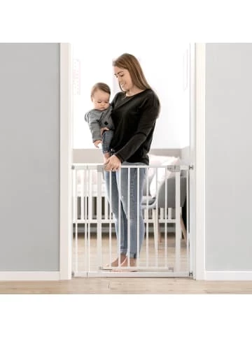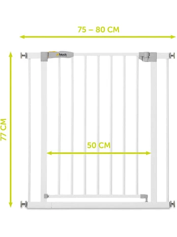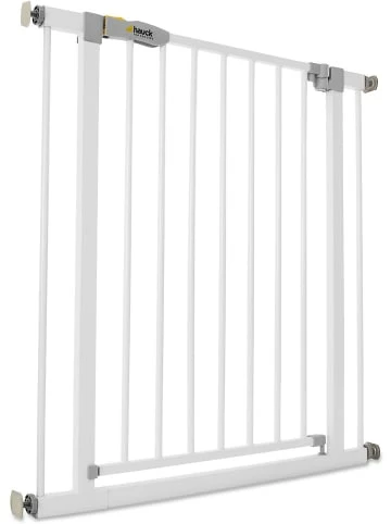 Das HAUCK Schutzgitter „Stop N Safe 2“ eignet sich zur Absicherung von Treppen und Durchgängen von 75 bis 80 Zentimetern. Das Gitter lässt sich mittels Stellschrauben sicher zwischen Treppenaufgängen, Wänden oder Türrahmen einspannen. Es muss nicht gebohrt werden. Zum Hindurchgehen können Erwachsene die fünfzig Zentimeter breite Tür mit nur einer Hand in beide Richtungen öffnen. Dadurch ist die andere Hand für den kleinen Schatz oder Einkaufstaschen frei. „Stop N Safe 2“ hat einen manuellen Schließmechanismus mit einer Zweifach-Sicherung, wodurch ein unkontrolliertes Öffnen durch Kinder verhindert wird.Durch die separat erhältlichen Verlängerungen von 9 cm bzw. 21 cm kann das Autoclose N Stop 2 auch für Treppenaufgänge bis zu 122 cm verwendet werden. Für runde Treppengeländer empfehlen wir zusätzlich Y-Spindeln, die anstelle der Stellschrauben, an einer Seite angebracht werden:75 – 80 cm = Kindergitter84 – 89 cm = Kindergitter + 9 cm Verlängerung (optional)93 – 98 cm = Kindergitter + 9 cm + 9 cm Verlängerungen (optional)96 – 101 cm = Kindergitter + 21 cm Verlängerung (optional)105 – 110 cm = Kindergitter + 9 cm + 21 cm Verlängerungen (optional)117 – 122 cm = Kindergitter + 21 cm + 21 cm Verlängerungen (optional)Details:– eignet sich für Durchgänge von 75 bis 80 cm– einfache Anbringung ohne Bohren– mit praktischer TürMaße:– aufgebaut: ca. 1,5/4 x 75-80 x 77 cm– Nettogewicht: ca. 3,8 kg– Höhe Türschutzgitter: ca. 77 cmMaterial: MetallHinweis:Bei diesem Artikel handelt es sich um ein selbstjustierendes Schutzgitter. Das anfänglich schief stehende Seitenteil wird durch das Anziehen der Stellschrauben gerade. So wird ein sicherer Halt und eine parallele Fixierung im Bereich des Schließmechanismus` gewährleistet.Altersempfehlung:ab 0 Monat(e) bis 24 Monat(e)