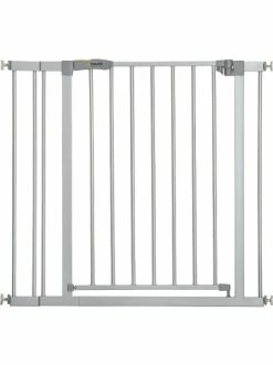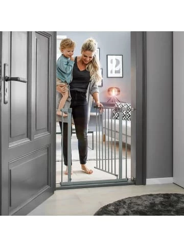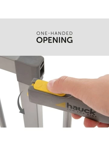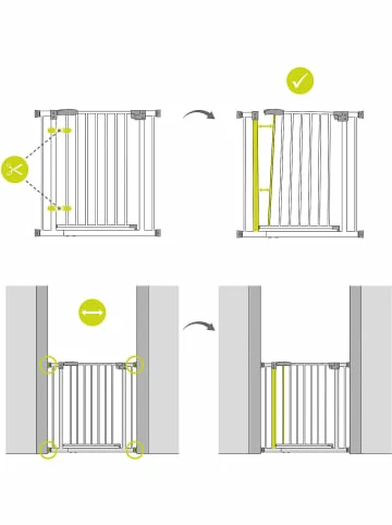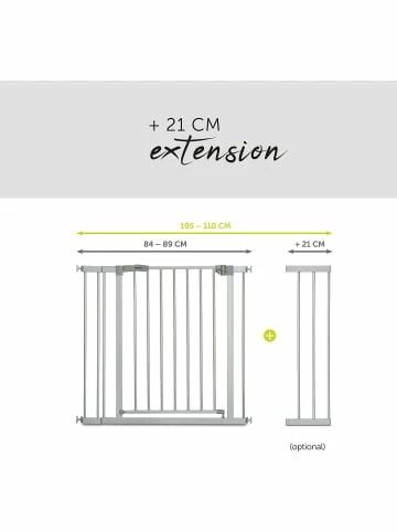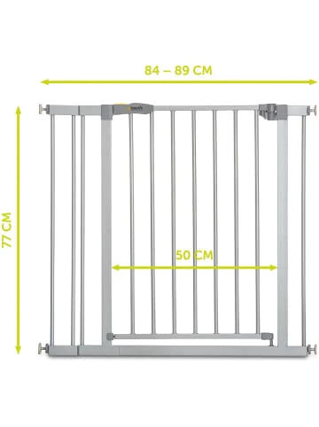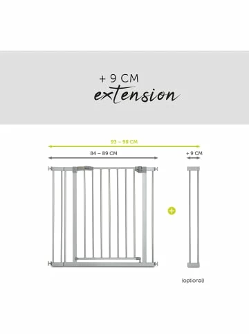 Das Tür- und Treppenschutzgitter Hauck Stop N Safe sichert Türen und Treppen mit einer Breite von 84 bis 89 Zentimeter zuverlässig ab. Tür- und Treppenschutzgitter Stop N Safe 2 von Hauck inkl. 9 cm Verlängerung geeignet für 84-89 cm Durchgangsbreite Klemm-Montage ohne Bohren einhändig in beide Richtungen öffenbar, manueller Schließmechanismus mit Zweifach-Sicherung Rückstandslose Montage: Das Gitter wird mithilfe von Stellschrauben sicher zwischen Türrahmen, Treppenaufgängen oder Wänden montiert. Es muss nicht gebohrt werden. Wird es nicht mehr gebraucht, lässt sich das Gitter rückstandslos entfernen. Besonders sicher: Der zweifache kindersichere Verschluss verhindert, dass Dein Kind das Absperrgitter unkontrolliert öffnet. Nur Erwachsene können den Verschluss bedienen und die Türe einhändig in beide Richtungen öffnen. So bleibt sogar noch eine Hand für den Nachwuchs frei. Tipp Mit separat erhältlichen Verlängerungen (9 cm bzw. 21 cm) lässt sich das Schutzgitter auf eine Breite bis zu 122 Zentimeter erweitern. Separat erhältliche Y-Spindeln ermöglichen außerdem die Befestigung an runden oder ovalen Treppengeländern. Folgende Kombinationen sind möglich: 75-80 cm = Kindergitter 84-89 cm = Kindergitter + 9 cm Verlängerung (optional) 93-98 cm = Kindergitter + 9 cm + 9 cm Verlängerungen (optional) 96-101 cm = Kindergitter + 21 cm Verlängerung (optional) 105-110 cm = Kindergitter + 9 cm + 21 cm Verlängerungen (optional) 117-122 cm = Kindergitter + 21 cm + 21 cm Verlängerungen (optional) Hinweis Bei diesem Artikel handelt es sich um ein selbstjustierendes Schutzgitter. Das anfänglich schief stehende Seitenteil wird durch das Anziehen der Stellschrauben gerade. So wird ein sicherer Halt und eine parallele Fixierung im Bereich des Schließmechanismuses ermöglicht.Länge: 0,1 cmBreite: 84 cmHöhe: 77 cmGeschlecht: UnisexAltersempfehlung:ab 0 Monat(e) bis 4 Jahr(e)
