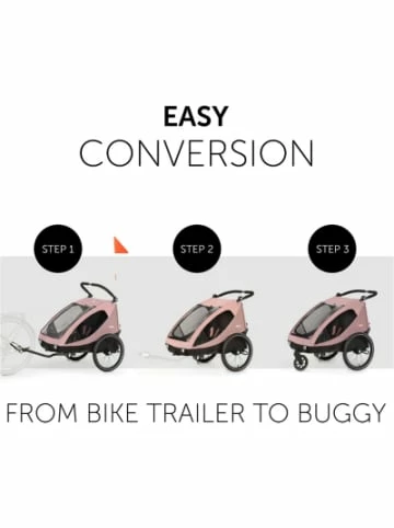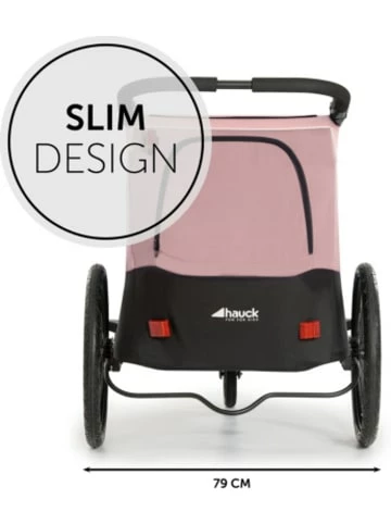 Der Dryk Duo von hauck vereint besonders praktisch und komfortabel Fahrradanhänger und Buggy in einem. Die mühelose Handhabung macht ihn zu einem treuen Begleiter, da der Umbau in nur vier Schritten funktioniert und er darüber hinaus einhändig gefaltet werden kann. Das Slim Design eignet sich ideal für den Alltag, ob zu Hause, auf dem Radweg oder in Geschäften. Der Dryk Duo bietet Platz für bis zu zwei Kinder. Die gut sichtbare und einfache Bedienung mithilfe der grauen Funktionstasten macht das Umbauen vom Buggy zum Fahrradanhänger und umgekehrt sehr intuitiv, sodass dieser auch alleine oder bei einer spontanen Planänderung umgerüstet werden kann. Ebenso ist das An- und Abkuppeln am Fahrrad dank der Deichsel und der doppelten Sicherung schnell erledigt. Ausgestattet ist der Dryk Duo mit einer Kombination aus einem feststellbaren Schwenkrad aus Gummi vorne und großen, luftbefüllten Rädern hinten. Auf diese Weise ist eine laufruhige Fahrt gewährleistet. Das Wetterverdeck lässt sich ideal bei Regen oder Fahrtwind benutzen, während das Moskitonetz im Sommer vor Insekten schützt und gleichzeitig für genügend Belüftung sorgt. Sie können einzeln oder beide zugleich an einer Gummischlaufe befestigt werden. Der besonders große XL Stauraum lässt sich mit einem Reißverschluss öffnen und schließen. Darüber hinaus gibt es praktische Innentaschen sowie weitere Taschen für das Vorderrad und die Deichsel.Details:– 2in1-Design: Fahrradanhänger und Buggy in einem– schmale Durchfahrtsbreite dank Slim Design– Einhand-Faltmechanismus für besonders hohen Bedienkomfort– leichtes An- und Abkuppeln – Umrüsten in wenigen Schritten– sichtbare, einfache Bedienung durch Funktionstasten– fixierbares Vorderrad aus Gummi und luftbefüllte Hinterräder für hohen Fahrkomfort– 2in1-Verdeck und 2in1-Fenster an der Seite, jeweils mit Wetterverdeck und Moskitonetz– XL-Stauraum mit Reißverschluss mit bis zu 6 kg beladbar– 2 mitgelieferte Taschen für Deichsel und Vorderrad– höhenverstellbarer Griff– 4 Reflektoren, ein LED-Licht, reflektierende Linien an Rädern und Bezug und ein Wimpel– einfach anzubringende 5-Punkt-Gurte– Feststellbremse– für bis zu zwei Kinder mit jeweils bis zu 22 kg Gewicht und je ca. 120 cm Körpergröße geeignetMaße: – Breite: ca. 79 cmLieferumfang: – 2in1 Fahrradanhänger und Buggy– 1 x Bedienungsanleitung– 1 x Komfort-Buggyrad– 1 x Deichsel– 1 x Sicherheits-Wimpel– 1 x LED-Rücklicht (ohne Batterien)– Radschutz– 1 x Transporttasche für Deichsel– 1x Transporttasche für VorderradHinweis: Es werden 2 x AAA Batterien (LR03) benötigt. Diese sind nicht im Lieferumfang enthalten.Unsere Entsorgungshinweise zu Batterien und Elektrogeräten finden Sie auf https://www.mytoys.de/c/entsorgungshinweise.htmlAltersempfehlung:ab 6 Monat(e) bis 6 Jahr(e)ACHTUNG: Die maximale Tragkraft beträgt 50kg.